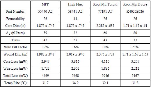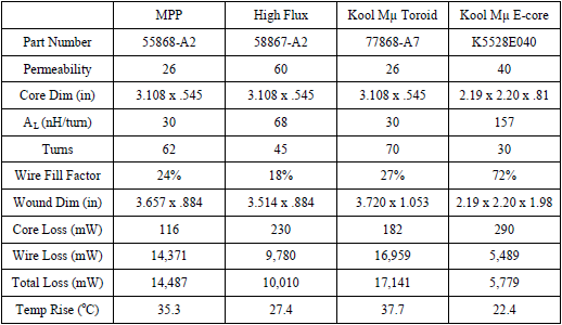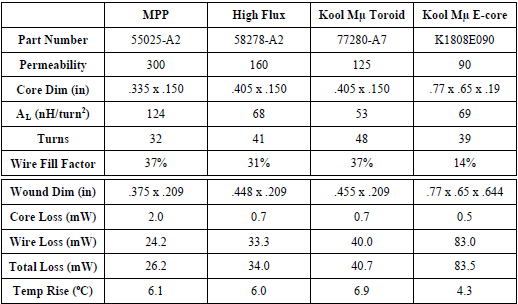 As the data illustrates, the MPP toroid yields the most compact and efficient design, due to the fact that this material is available in a higher permeability (300μ) as compared with the others. This translates into a higher inductance factor (AL) for a given core size, allowing a smaller core to be used. The trade off is that the DC bias rolls off sooner. The Kool Mμ toroid is attractive mainly by virtue of a significant cost advantage. The Kool Mμ E-core selected is the smallest currently available, and it is oversized for this particular set of requirements.