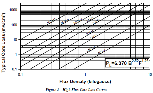 The magnetizing force excursion is from 0 oersteds to 53.4 oersteds. In the 14-permeability material this translates to a flux density excursion from 0 gauss to 600 gauss. I.e., the ΔB is 600G. Loss curves for soft magnetic materials presume bipolar operation (the core is driven into the 1st and 3rd quadrants of the BH loop.) Consequently, no matter whether the circuit is bipolar or unipolar, the flux density value that applies is always ½ΔB. In this case, the AC flux density is 300G. From Figure 5, for 300G at 100kHz, the loss density is about 150 mW/cc. From the databook, the volume of the 58441-A2 is found to be 21.3 cm3, so the total core loss is the product (150)(21.3) = 3195 mW. The design tool, using curve fit equations, calculated core losses of 3316 mW.