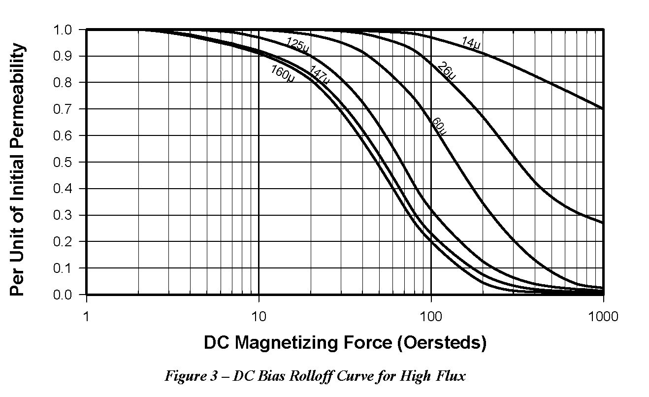 The percent of initial permeability or “roll off” value can be determined from Figure 3 - DC Bias Rolloff Curve for High Flux.