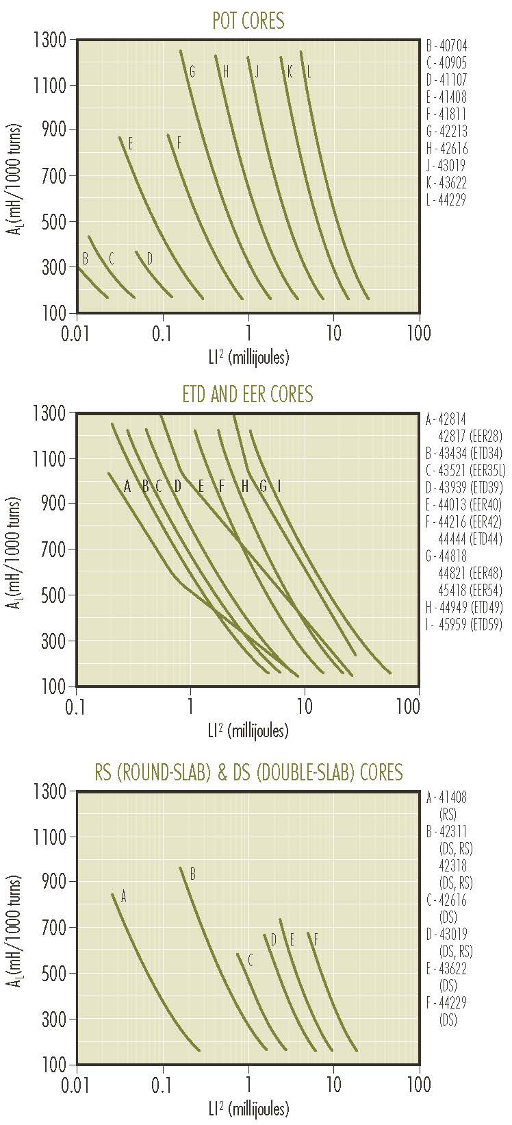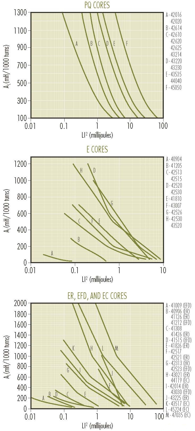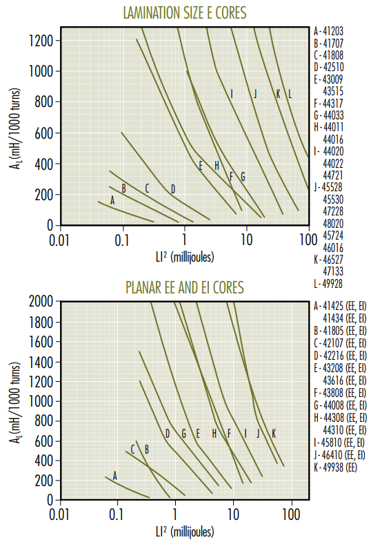 3. Any core size line that intersects the LI² coordinate represents a workable core for the inductor if the core’s AL value is less than the maximum value obtained on the chart.