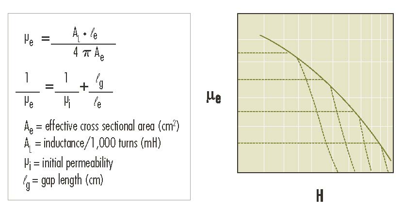 The above curves represent the locus of points up to which effective permeability remains constant. They show the maximum allowable DC bias, in ampere-turns, without a reduction in inductance. Beyond this level, inductance drops rapidly.