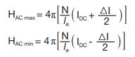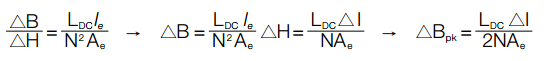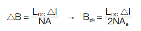 Flux density (B) is a non-linear function of magnetizing field (H), which in turn is a function of winding number of turns (N), current (I), and magnetic path length (le). The value of Bpk can typically be determined by first calculating H at each AC extreme:
