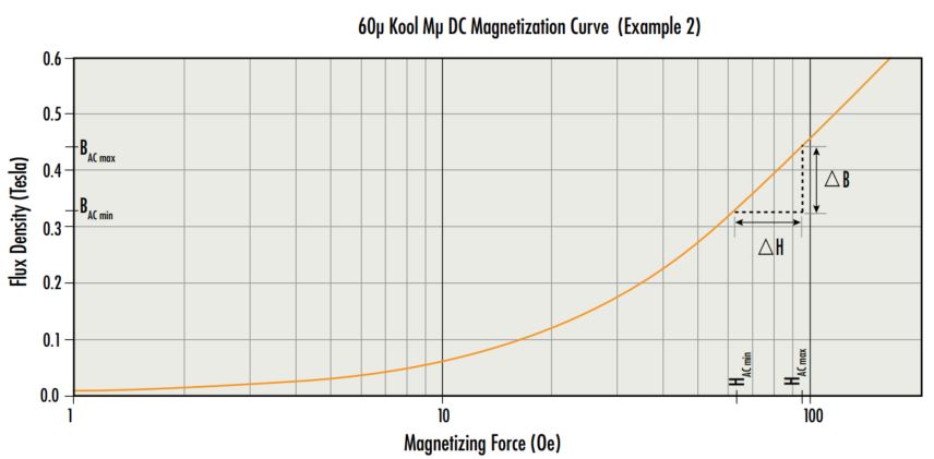 From HAC max, HAC min, and the BH curve or equation (listed in Magnetics Powder Core Catalog pgs. 112-132), BAC max, BAC min and therefore Bpk can be determined.