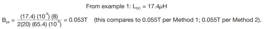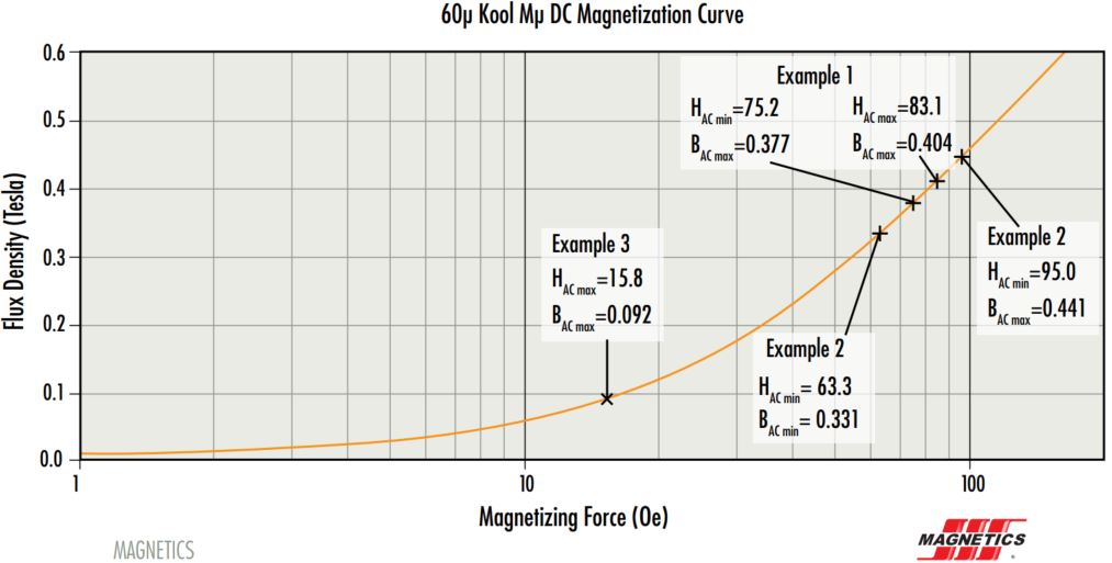 Note the significant influence of DC bias on core loss, comparing Example 3 with Example 2. Lower permeability results in less Bpk, even if the current ripple is the same. This effect can be achieved with DC bias, or by selecting a lower permeability material.