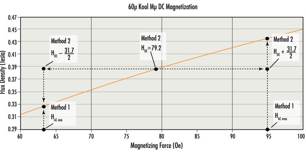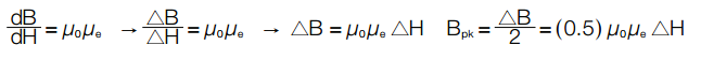 The instantaneous slope of the BH curve is defined as the absolute permeability, which is the product of permeability of free space (μ0=4π x10-7) and the material permeability (μ), which varies along the BH curve. For small AC, this slope can be modeled as a constant throughout AC excitation, with μ approximating the effective perm at DC bias (μe):