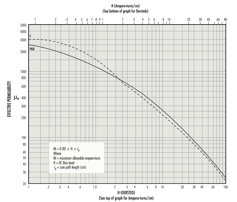 The above curves represent the locus of points up to which effective permeability remains constant. They show the maximum allowable DC bias, in ampere-turns, without a reduction in inductance. Beyond this level, inductance drops rapidly.