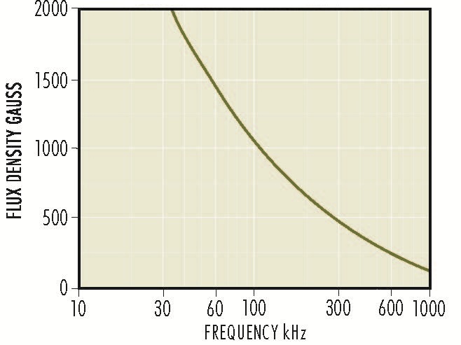 The Power Chart characterizes the power handling capacity of each ferrite core based upon the frequency of operation, the circuit topology, the flux level selected, and the amount of power required by the circuit. If these four specifics are known, the core can be selected from the Typical Power Handling Chart.