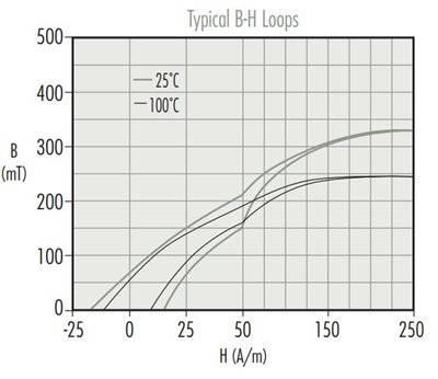 | Saturation Flux Density (3,600 G at 15 Oe, 25°C) | 360 mT, 11.9 A•T/cm |