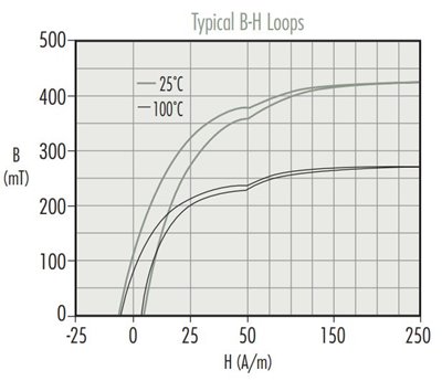 | Saturation Flux Density (4,300 G at 15 Oe, 25°C) | 430 mT, 11.9 A•T/cm |
