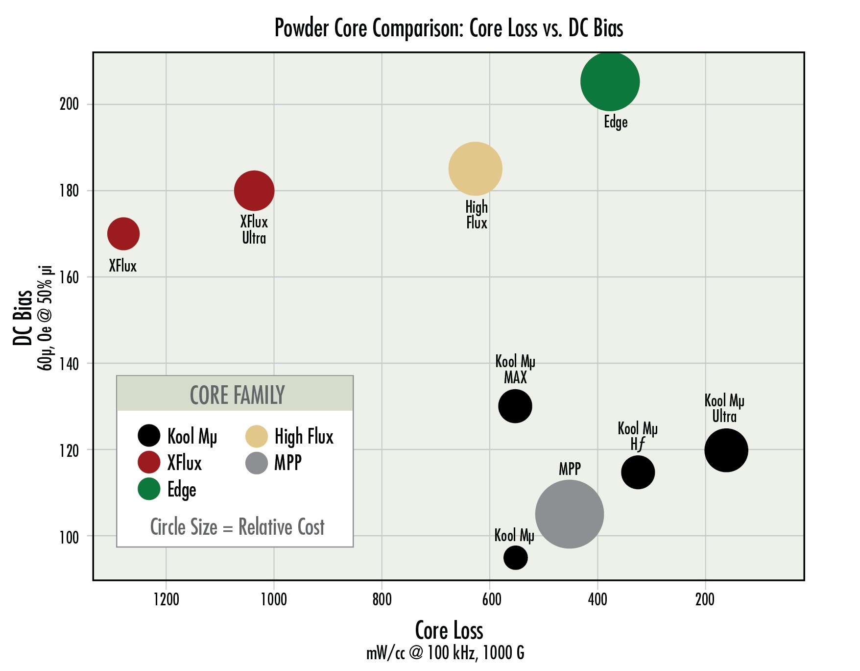 - For the most efficient design using the smallest core, Edge is the best choice, offering the highest DC bias, best temperature stability, and approximately 40% lower losses compared to High Flux.